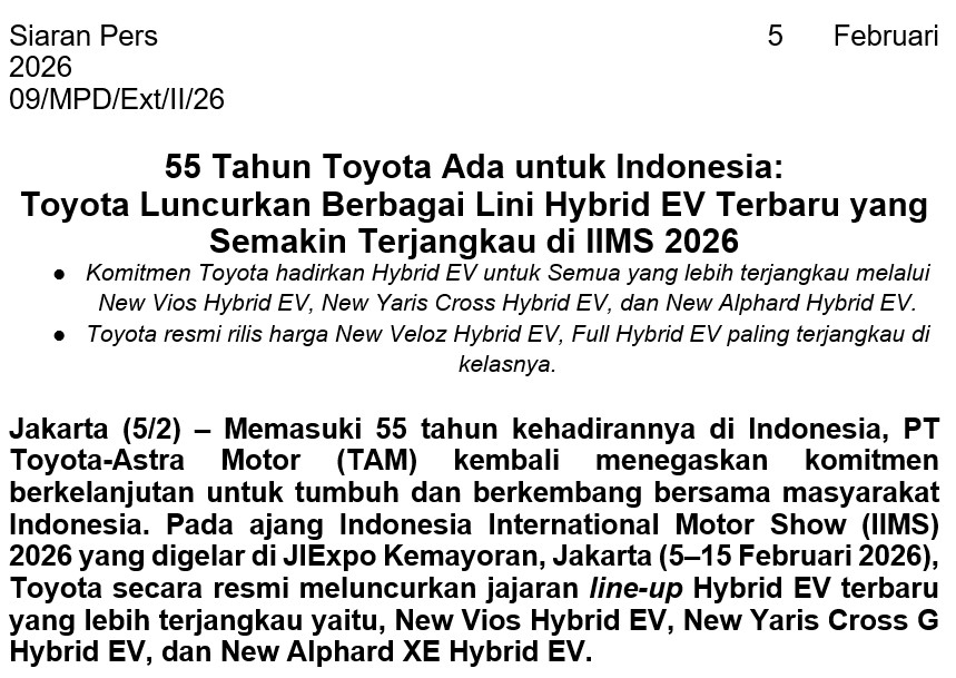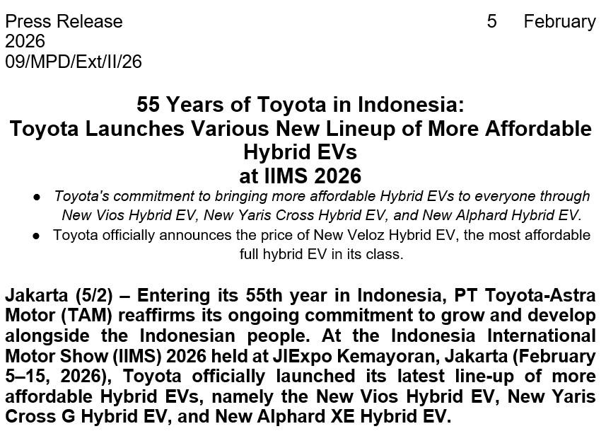 Jakarta (5/2) – Memasuki 55 tahun kehadirannya di Indonesia, PT Toyota-Astra Motor (TAM) kembali menegaskan komitmen berkelanjutan untuk tumbuh dan berkembang bersama masyarakat Indonesia. Pada ajang Indonesia International Motor Show (IIMS) 2026 yang digelar di JIExpo Kemayoran, Jakarta (5–15 Februari 2026), Toyota secara resmi meluncurkan jajaran line-up Hybrid EV terbaru yang lebih terjangkau yaitu, New Vios Hybrid EV, New Yaris Cross G Hybrid EV, dan New Alphard XE Hybrid EV.