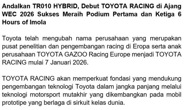 Selama ini, Toyota berkompetisi di ajang World Endurance Championship (WEC) atau balap ketahanan dunia di bawah nama besar TOYOTA GAZOO Racing (TGR) dari tahun 2016. Mulai musim 2026, tim akan berpartisipasi di bawah bendera baru TOYOTA RACING dengan mengandalkan Hypercar TR010 HYBRID yang telah diperbarui.