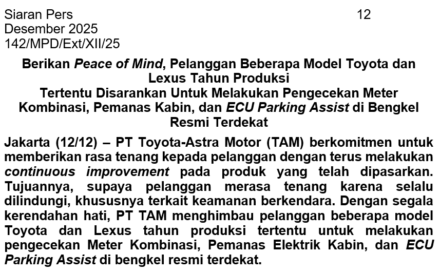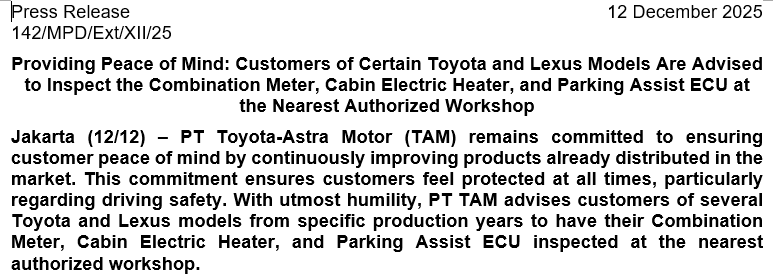Jakarta (12/12) – PT Toyota-Astra Motor (TAM) berkomitmen untuk memberikan rasa tenang kepada pelanggan dengan terus melakukan continuous improvement pada produk yang telah dipasarkan. Tujuannya, supaya pelanggan merasa tenang karena selalu dilindungi, khususnya terkait keamanan berkendara. Dengan segala kerendahan hati, PT TAM menghimbau pelanggan beberapa model Toyota dan Lexus tahun produksi tertentu untuk melakukan pengecekan Meter Kombinasi, Pemanas Elektrik Kabin, dan ECU Parking Assist di bengkel resmi terdekat.