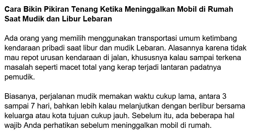 Cara Bikin Pikiran Tenang Ketika Meninggalkan Mobil di Rumah Saat Mudik dan Libur Lebaran