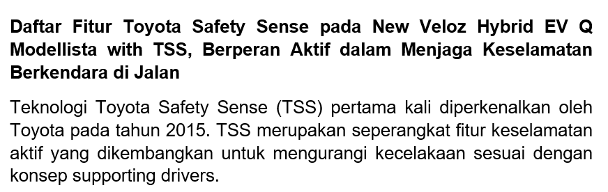 Pertama di kelasnya, Veloz telah dilengkapi dengan TSS sejak pertama launching di tahun 2022. Saat ini, setelah bertransformasi menjadi MPV Hybrid, kendaraan keluarga ini tetap melengkapi dirinya dengan fitur-fitur TSS. Di antaranya adalah: