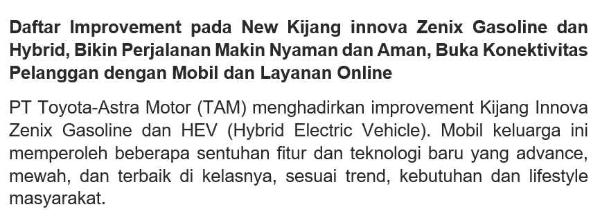 PT Toyota-Astra Motor (TAM) menghadirkan improvement Kijang Innova Zenix Gasoline dan HEV (Hybrid Electric Vehicle). Mobil keluarga ini memperoleh beberapa sentuhan fitur dan teknologi baru yang advance, mewah, dan terbaik di kelasnya, sesuai trend, kebutuhan dan lifestyle masyarakat.