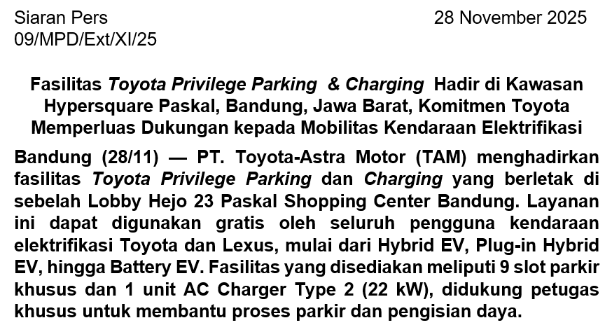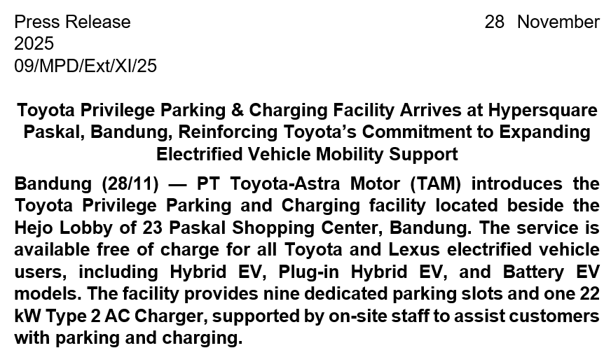 Bandung (28/11) PT. Toyota-Astra Motor (TAM) menghadirkan fasilitas Toyota Privilege Parking dan Charging yang berletak di sebelah Lobby Hejo 23 Paskal Shopping Center Bandung. Layanan ini dapat digunakan gratis oleh seluruh pengguna kendaraan elektrifikasi Toyota dan Lexus, mulai dari Hybrid EV, Plug-in Hybrid EV, hingga Battery EV. Fasilitas yang disediakan meliputi 9 slot parkir khusus dan 1 unit AC Charger Type 2 (22 kW), didukung petugas khusus untuk membantu proses parkir dan pengisian daya.