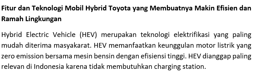 Hybrid Electric Vehicle (HEV) merupakan teknologi elektrifikasi yang paling mudah diterima masyakarat. HEV memanfaatkan keunggulan motor listrik yang zero emission bersama mesin bensin dengan efisiensi tinggi. HEV dianggap paling relevan di Indonesia karena tidak membutuhkan charging station.