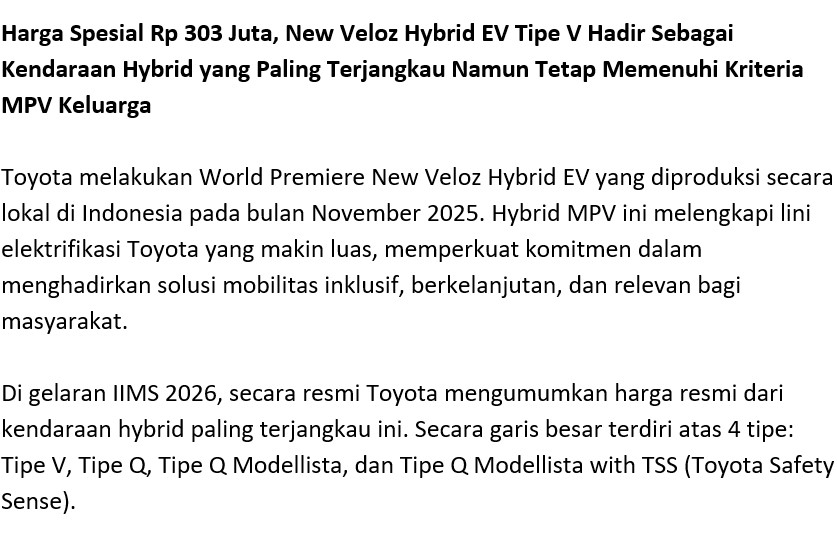 Toyota melakukan World Premiere New Veloz Hybrid EV yang diproduksi secara lokal di Indonesia pada bulan November 2025. Hybrid MPV ini melengkapi lini elektrifikasi Toyota yang makin luas, memperkuat komitmen dalam menghadirkan solusi mobilitas inklusif, berkelanjutan, dan relevan bagi masyarakat.