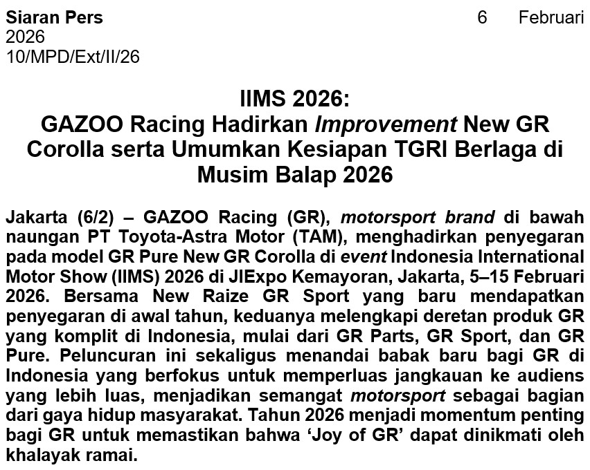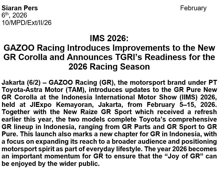 Jakarta (6/2) – GAZOO Racing (GR), motorsport brand di bawah naungan PT Toyota-Astra Motor (TAM), menghadirkan penyegaran pada model GR Pure New GR Corolla di event Indonesia International Motor Show (IIMS) 2026 di JIExpo Kemayoran, Jakarta, 5–15 Februari 2026. Bersama New Raize GR Sport yang baru mendapatkan penyegaran di awal tahun, keduanya melengkapi deretan produk GR yang komplit di Indonesia, mulai dari GR Parts, GR Sport, dan GR Pure. Peluncuran ini sekaligus menandai babak baru bagi GR di Indonesia yang berfokus untuk memperluas jangkauan ke audiens yang lebih luas, menjadikan semangat motorsport sebagai bagian dari gaya hidup masyarakat. Tahun 2026 menjadi momentum penting bagi GR untuk memastikan bahwa ‘Joy of GR’ dapat dinikmati oleh khalayak ramai.