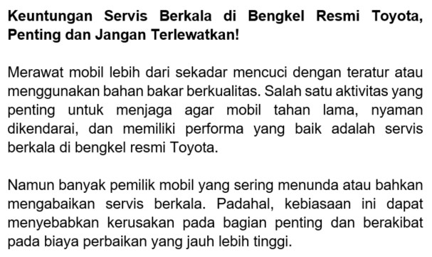 Untuk kualitas terbaik dan memuaskan, sebaiknya servis berkala di bengkel resmi Toyota. Berikut beberapa keuntungan servis berkala di bengkel resmi Toyota: