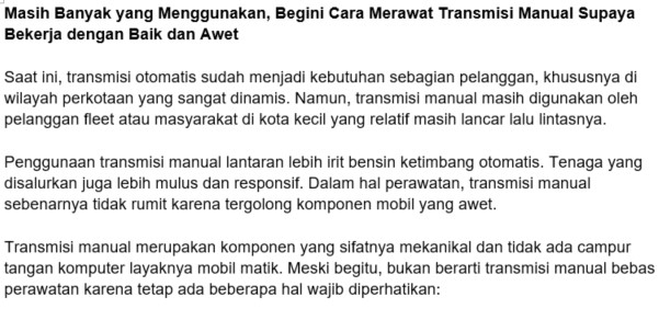 Transmisi manual merupakan komponen yang sifatnya mekanikal dan tidak ada campur tangan komputer layaknya mobil matik. Meski begitu, bukan berarti transmisi manual bebas perawatan karena tetap ada beberapa hal wajib diperhatikan: