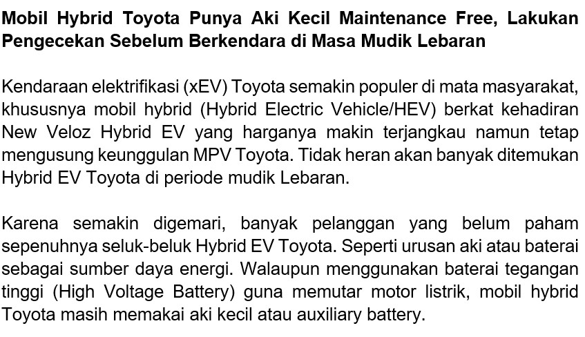 Mobil Hybrid Toyota Punya Aki Kecil Maintenance Free, Lakukan Pengecekan Sebelum Berkendara di Masa Mudik Lebaran