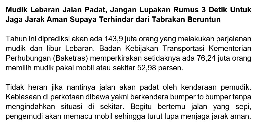 Tidak heran jika nantinya jalan akan padat oleh kendaraan pemudik. Kebiasaan di perkotaan dibawa yakni berkendara bumper to bumper tanpa mengindahkan situasi di sekitar. Begitu bertemu jalan yang sepi, pengemudi akan memacu mobil sehingga turut lupa menjaga jarak aman.