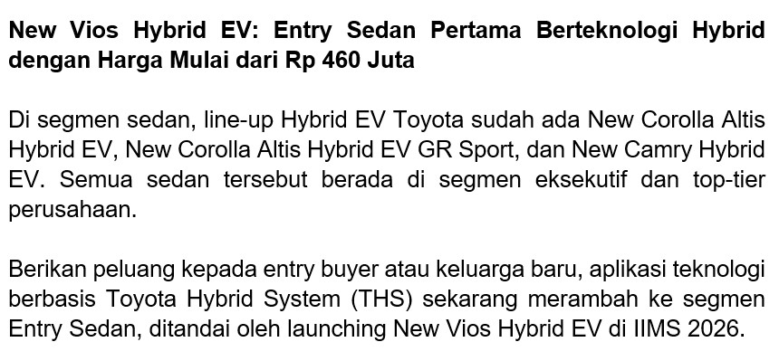 Berikan peluang kepada entry buyer atau keluarga baru, aplikasi teknologi berbasis Toyota Hybrid System (THS) sekarang merambah ke segmen Entry Sedan, ditandai oleh launching New Vios Hybrid EV di IIMS 2026.