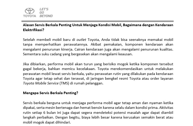 © Copyright PT TOYOTA ASTRA MOTOR. Seluruh hak dilindungi. Teks, gambar, grafik, berkas suara/audio, berkas (file) animasi, berkas video, dan semua komposisinya pada situs web TOYOTA seluruhnya tunduk pada Hukum Perlindungan Hak Cipta dan Hak Kekayaan Intelektual lainnya. Semua konten/materi di situs web ini tidak dapat disalin untuk penggunaan komersial atau distribusi, juga tidak dapat diubah atau dibagikan ke situs lain.