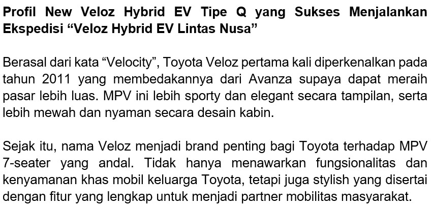 Profil Singkat New Veloz Hybrid EV Tipe Q