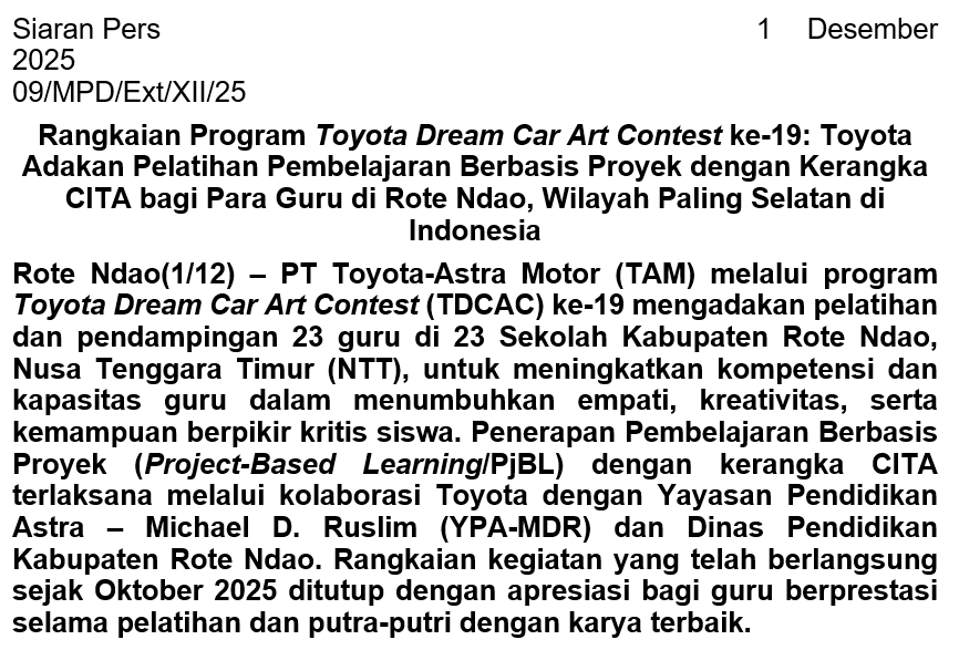 Rote Ndao(1/12) – PT Toyota-Astra Motor (TAM) melalui program Toyota Dream Car Art Contest (TDCAC) ke-19 mengadakan pelatihan dan pendampingan 23 guru di 23 Sekolah Kabupaten Rote Ndao, Nusa Tenggara Timur (NTT), untuk meningkatkan kompetensi dan kapasitas guru dalam menumbuhkan empati, kreativitas, serta kemampuan berpikir kritis siswa. Penerapan Pembelajaran Berbasis Proyek (Project-Based Learning/PjBL) dengan kerangka CITA terlaksana melalui kolaborasi Toyota dengan Yayasan Pendidikan Astra – Michael D. Ruslim (YPA-MDR) dan Dinas Pendidikan Kabupaten Rote Ndao. Rangkaian kegiatan yang telah berlangsung sejak Oktober 2025 ditutup dengan apresiasi bagi guru berprestasi selama pelatihan dan putra-putri dengan karya terbaik.