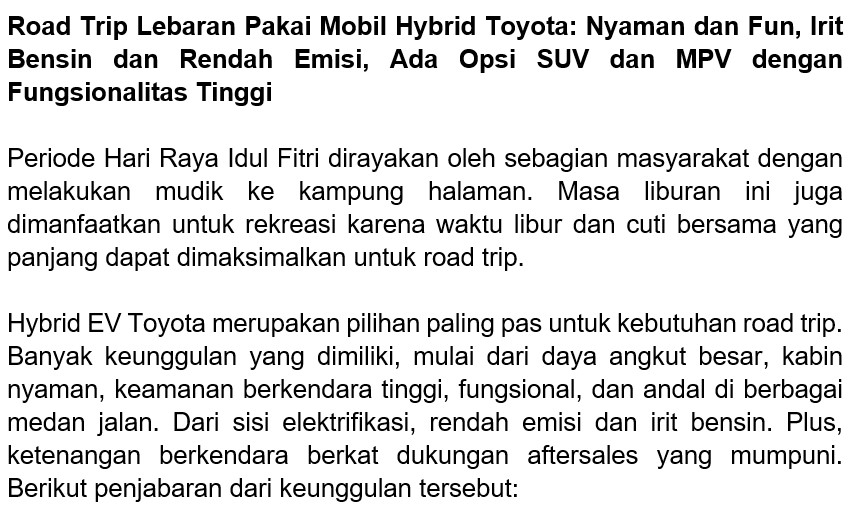 Road Trip Lebaran Pakai Mobil Hybrid Toyota: Nyaman dan Fun, Irit Bensin dan Rendah Emisi, Ada Opsi SUV dan MPV dengan Fungsionalitas Tinggi