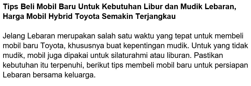 Jelang Lebaran merupakan salah satu waktu yang tepat untuk membeli mobil baru Toyota, khususnya buat kepentingan mudik. Untuk yang tidak mudik, mobil juga dipakai untuk silaturahmi atau liburan. Pastikan kebutuhan itu terpenuhi, berikut tips membeli mobil baru untuk persiapan Lebaran bersama keluarga.