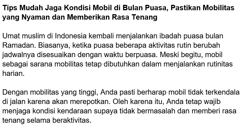Umat muslim di Indonesia kembali menjalankan ibadah puasa bulan Ramadan. Biasanya, ketika puasa beberapa aktivitas rutin berubah jadwalnya disesuaikan dengan waktu berpuasa. Meski begitu, mobil sebagai sarana mobilitas tetap dibutuhkan dalam menjalankan rutinitas harian.