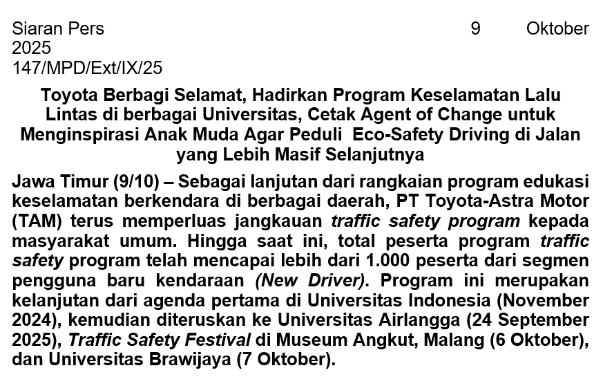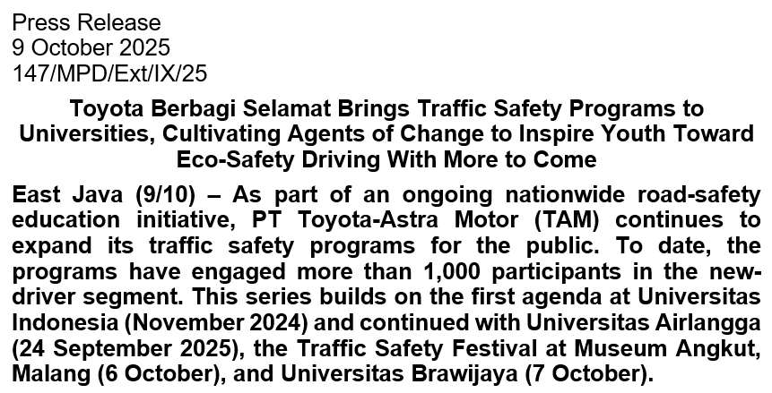Jawa Timur (9/10) – Sebagai lanjutan dari rangkaian program edukasi keselamatan berkendara di berbagai daerah, PT Toyota-Astra Motor (TAM) terus memperluas jangkauan traffic safety program kepada masyarakat umum. Hingga saat ini, total peserta program traffic safety program telah mencapai lebih dari 1.000 peserta dari segmen pengguna baru kendaraan (New Driver). Program ini merupakan kelanjutan dari agenda pertama di Universitas Indonesia (November 2024), kemudian diteruskan ke Universitas Airlangga (24 September 2025), Traffic Safety Festival di Museum Angkut, Malang (6 Oktober), dan Universitas Brawijaya (7 Oktober).