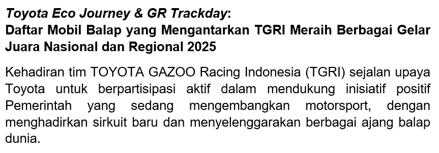 Kehadiran tim TOYOTA GAZOO Racing Indonesia (TGRI) sejalan upaya Toyota untuk berpartisipasi aktif dalam mendukung inisiatif positif Pemerintah yang sedang mengembangkan motorsport, dengan menghadirkan sirkuit baru dan menyelenggarakan berbagai ajang balap dunia.