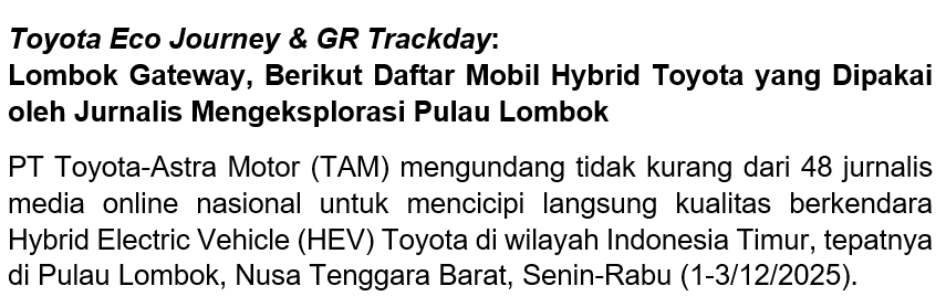 PT Toyota-Astra Motor (TAM) mengundang tidak kurang dari 48 jurnalis media online nasional untuk mencicipi langsung kualitas berkendara Hybrid Electric Vehicle (HEV) Toyota di wilayah Indonesia Timur, tepatnya di Pulau Lombok, Nusa Tenggara Barat, Senin-Rabu (1-3/12/2025).