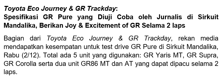 Toyota Eco Journey & GR Trackday:  Spesifikasi GR Pure yang Diuji Coba oleh Jurnalis di Sirkuit Mandalika, Berikan Joy & Excitement of GR Selama 2 laps