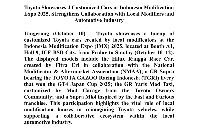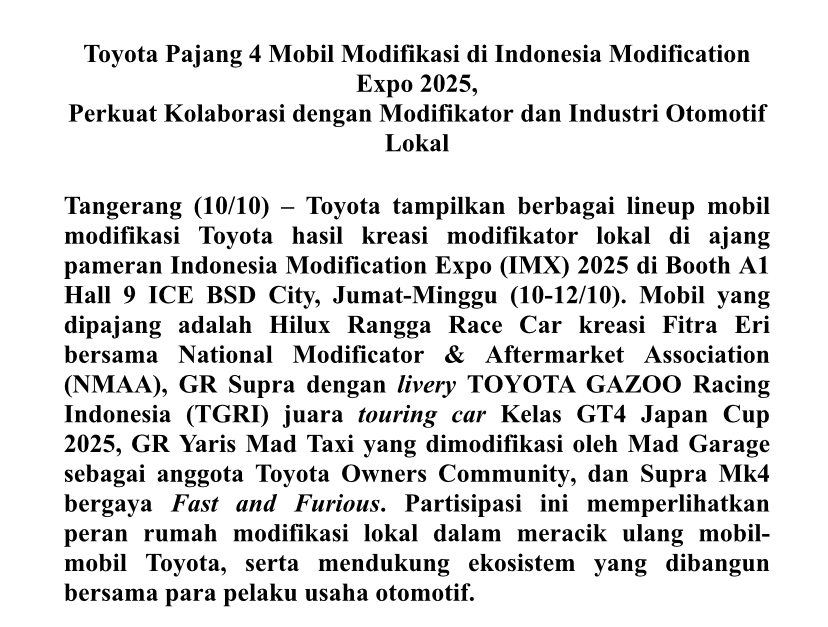 Tangerang (10/10) – Toyota tampilkan berbagai lineup mobil modifikasi Toyota hasil kreasi modifikator lokal di ajang pameran Indonesia Modification Expo (IMX) 2025 di Booth A1Hall 9 ICE BSD City, Jumat-Minggu (10-12/10). Mobil yang dipajang adalah Hilux Rangga Race Car kreasi Fitra Eri bersama National Modificator & Aftermarket Association (NMAA), GR Supra dengan livery TOYOTA GAZOO Racing Indonesia (TGRI) juara touring car Kelas GT4 Japan Cup 2025, GR Yaris Mad Taxi yang dimodifikasi oleh Mad Garage sebagai anggota Toyota Owners Community, dan Supra Mk4 bergaya Fast and Furious. Partisipasi ini memperlihatkan peran rumah modifikasi lokal dalam meracik ulang mobil-mobil Toyota, serta mendukung ekosistem yang dibangun bersama para pelaku usaha otomotif.